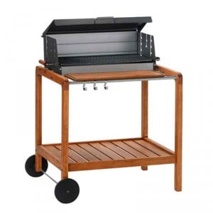 amovible et les 3 portes crochets. Pour plus de mobilité, ce barbecue est doté d’un chariot à roulettes.
